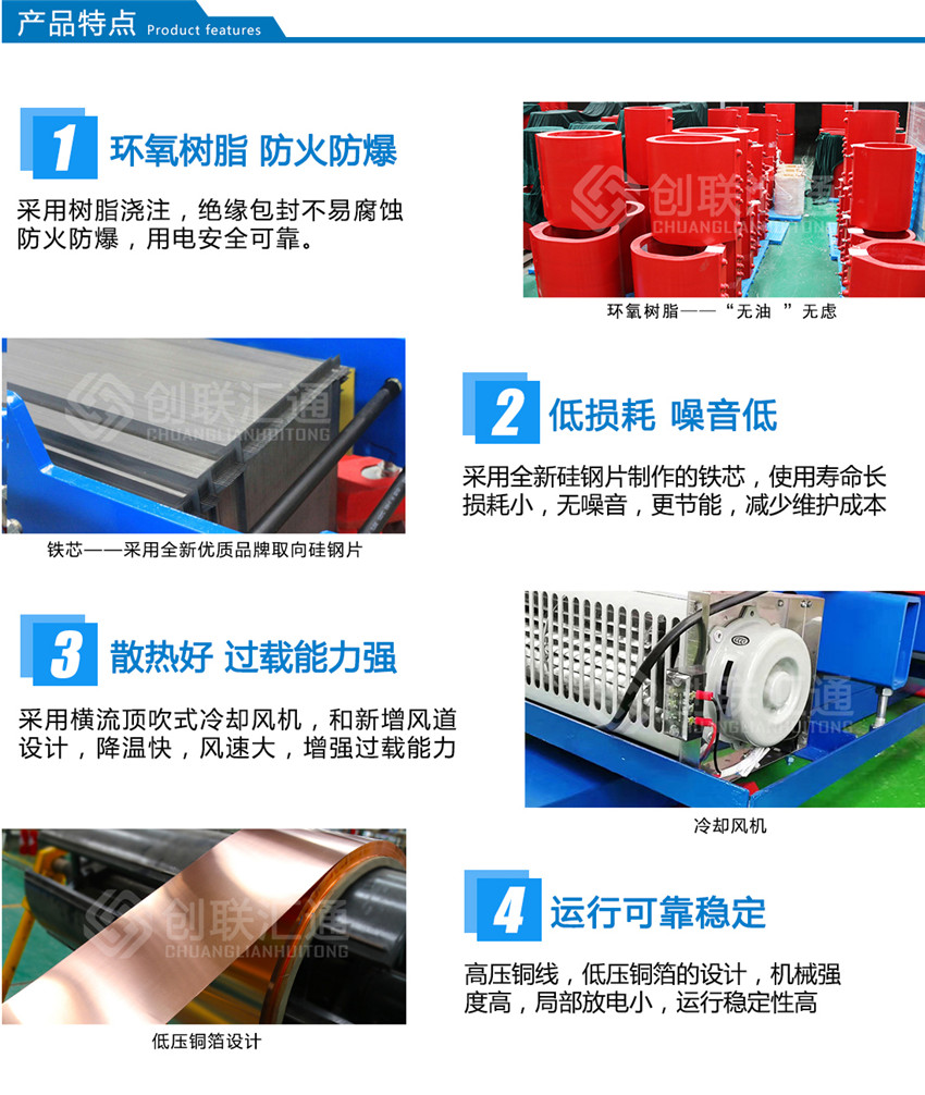3、結構堅固,SCB11干式變壓器繞組采用環氧樹脂澆注固化成型,機械強度高,抗短路能力強。