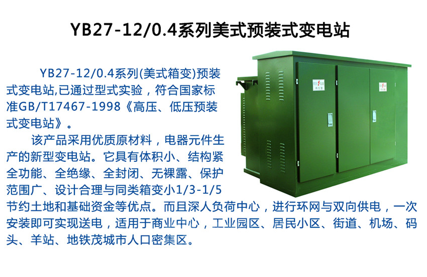YB27-12/0.4預裝式變電站是產化美式箱變。該產品作為電纜化配電網中重要的供電單元,集高壓控制、保護、變電、以及配電設備于一體的成套預裝產品,廣泛應用于城鄉配電網之中。